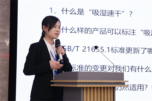 中紡標檢測事業部技術主管、高級工程師、資深培訓師鄭園園對吸濕速干類紡織品相關標準進行了解析。她闡述了吸濕速干的原理及檢測方法以及該項目在GB/T 21655.1標準修訂后的主要變更內容,在如何改善產品的吸濕速干性能方面給出了專業建議,并重點強調了功能性產品標識的注意事項。