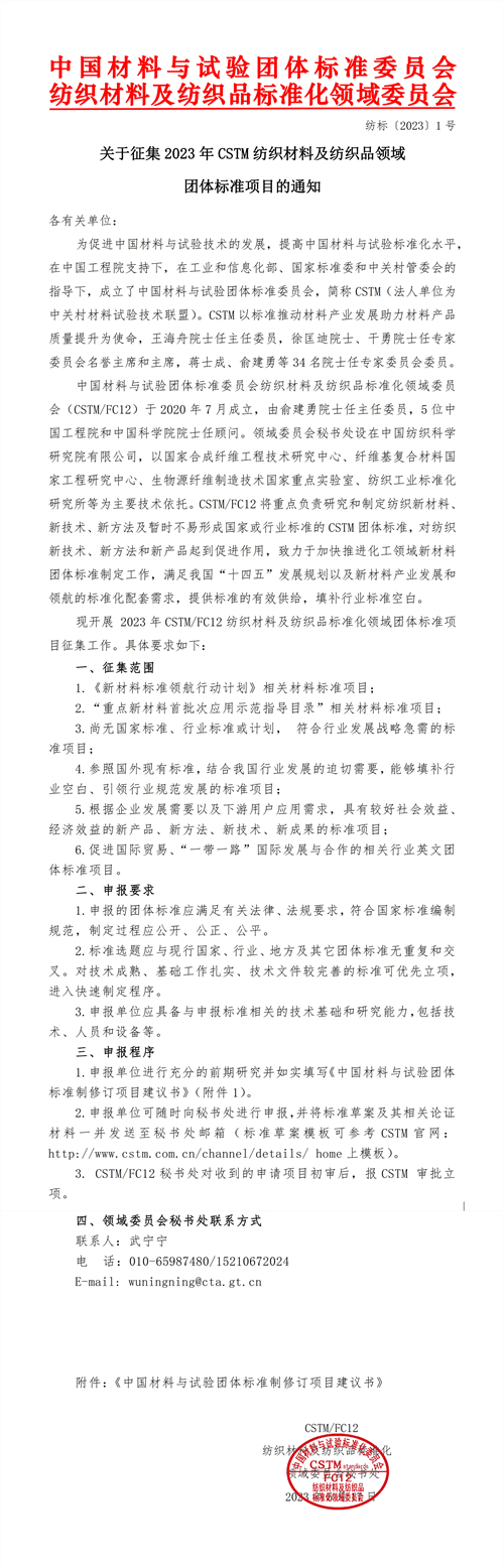 附件:關(guān)于征集2023年CSTM紡織材料及紡織品領(lǐng)域團(tuán)體標(biāo)準(zhǔn)項(xiàng)目的通知