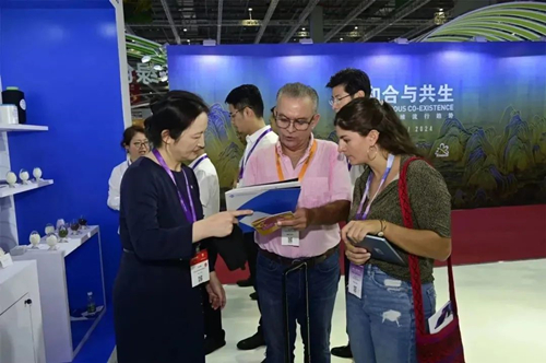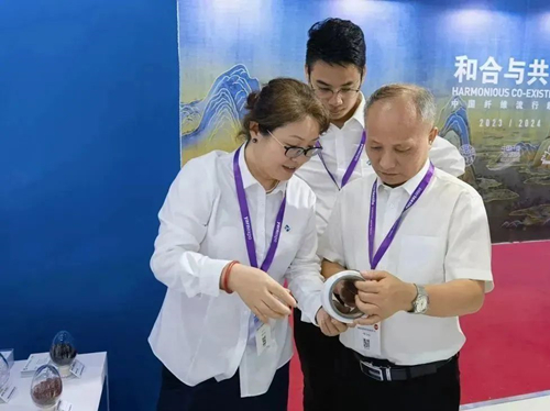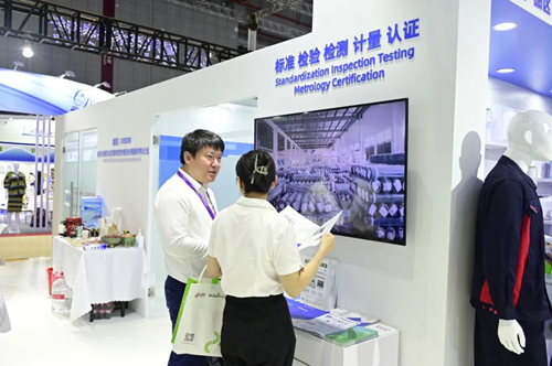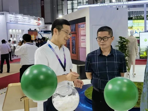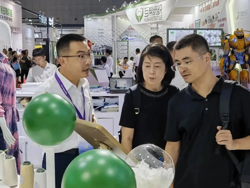 通用技術集團副總經理、黨組成員賈大風現場實地調研考察通用技術新材展團,詳細了解纖維新材料、化纖裝備制造與工程服務、紡織新材料、標準檢測與技術服務等業務板塊參展情況,并對此次展示的綠纖、特纖、高纖產品及制品的技術創新點和經濟效益及社會效益情況進行了深入溝通。